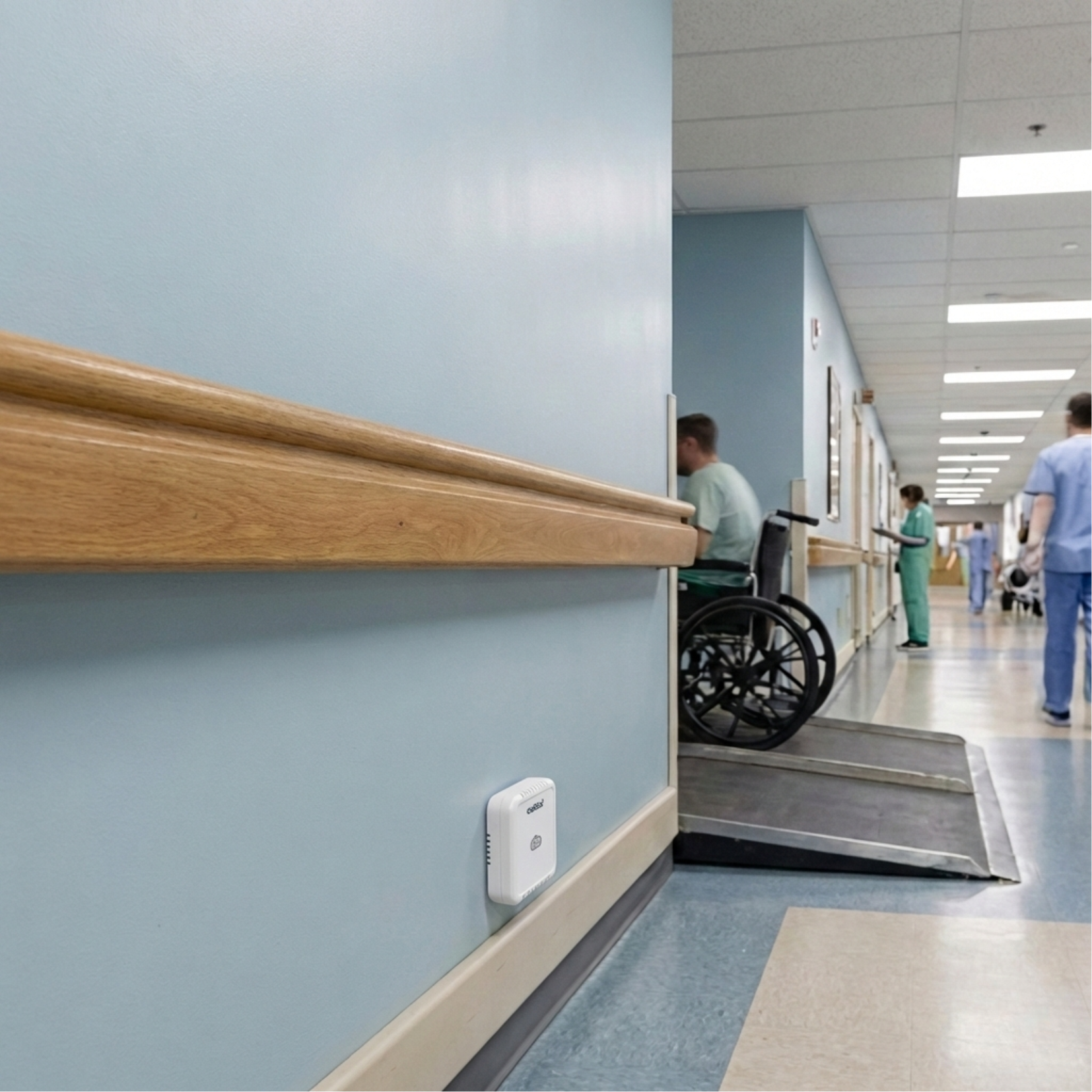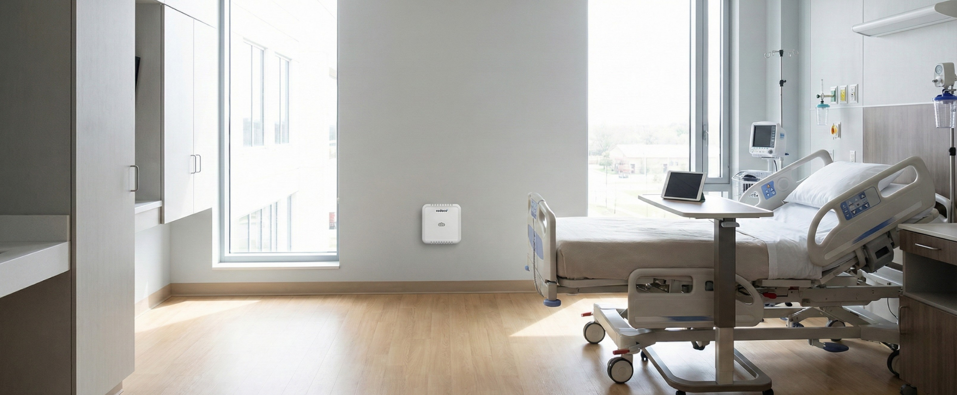 The sensors measure ambient air temperature, relative humidity, CO₂ concentration, and the Air Quality Index. The air quality status is indicated by an LED traffic light system that lights up green, orange, or red. This provides a complete overview of the environment, allowing for an immediate response to deteriorating conditions.